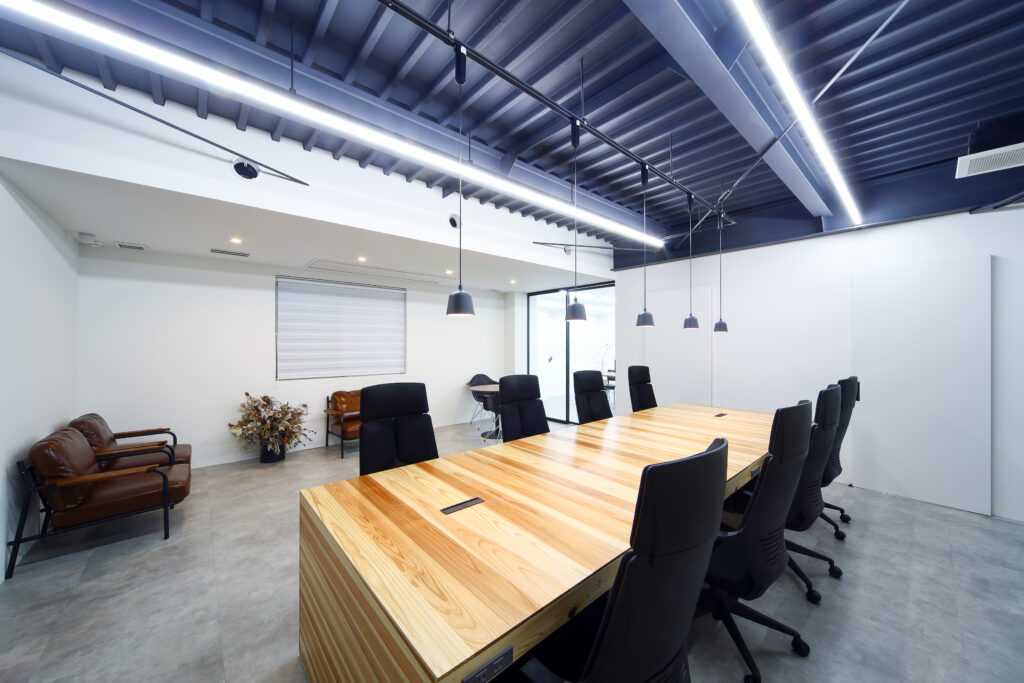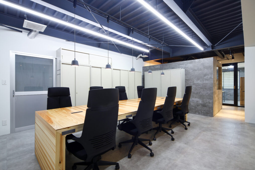 僕は“コワーキングスペース”と呼んでいるのですが、机の納期の問題や、既製品を並べて配線などを全て実現するのが難しかったため、今回造作でデザインして大テーブルを作るという決断をしました。オフィス家具は日本ではなかなか大きいテーブルはいいのがなく、今回製作することにしました。実はここで作った大テーブルは、他のオフィスリノベーション案件でも使わせていただきました。オフィス家具という、私自身の考え方や、今回新しい一歩を踏み出せたこと、とても感謝しております。
